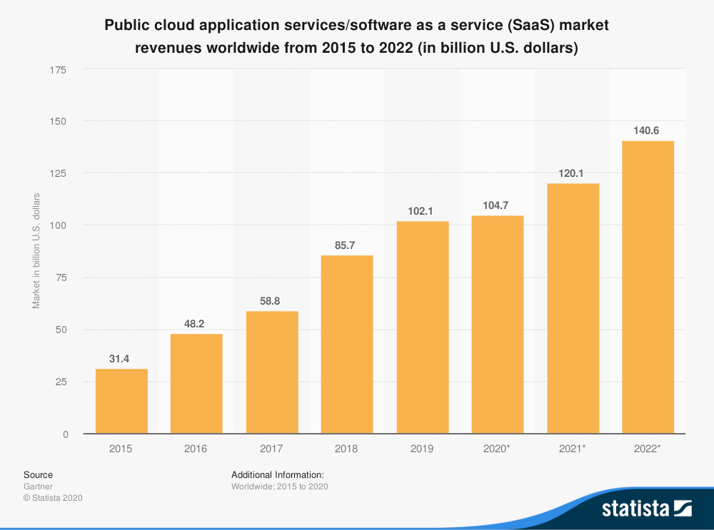 The trend toward SaaS vs. traditional software license purchases has been a huge trend over the past two decades. In 1999, Salesforce launched their customer relationship management (CRM) platform as the first SaaS solution built from scratch.